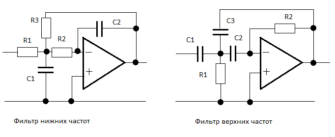 В соответсвии с принципом наложения (суперпозиции) напряжение в точке n будет равно сумме напряжений от отдельных источников: Un = K•E1 + K10•E10 + K20•E20 + ... + Kn0•En0 Как рассчитать К мы уже знаем: это формула (1). Т.е. мы как бы закорачиваем все остальные источники напряжения, кроме E1. Для нахождения K10 поступаем аналогично, закоротив все источники, кроме E10. И так поступаем для всех источников в данной схеме. Для полной общности можно было бы расположить источники напряжений так же и в горизонтальных ветвях схемы, но, во-первых, такой случай встречается крайне редко (всё же источники одним концом обычно заземляются), а, во-вторых, не составит труда рассчитать коэффициенты и для этого случая. Заметим также, что на месте источников напряжения могли бы быть источники токов. В этом случае мы бы не закорачивали, а наоборот как бы убирали источники полагая, что на их месте возникает разрыв цепи. Практическое применение метода наложенияНа странице Расчёт активных фильтров нижних и верхних частот мы рассмотрели расчет активных фильтров нижних и верхних частот, изображённых на следующей схеме: