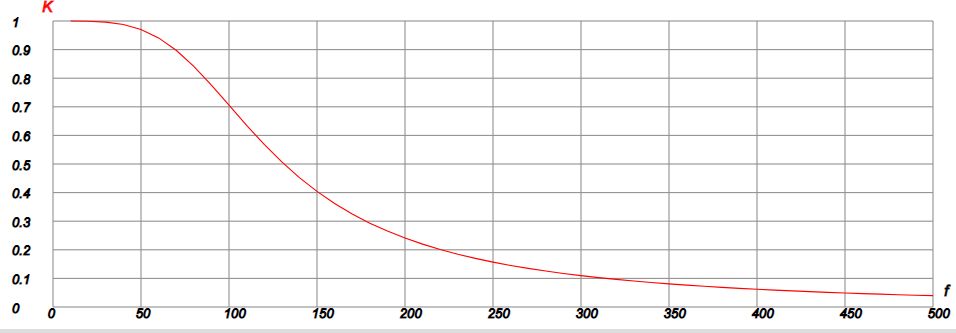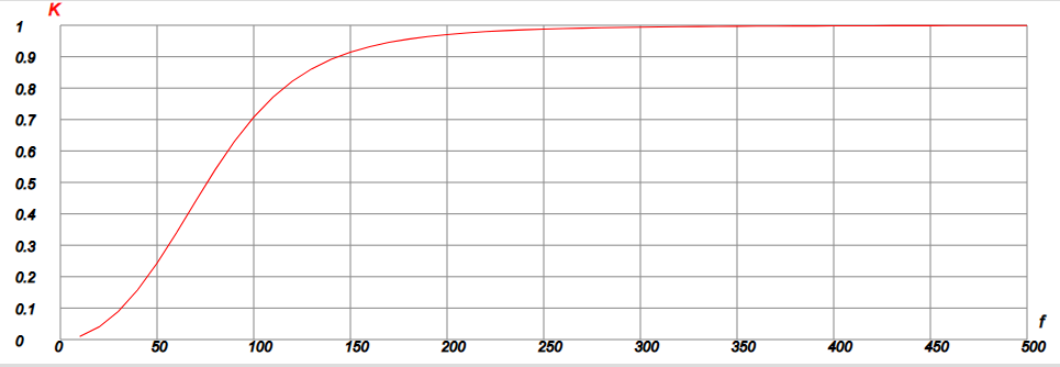 f = 10 f2 = 500 [ w = 2*pi*f R1 = 160 R2 = R1 R3 = 160 C1 = 2.12E-5 C2 = 4.7E-6 Z1 = R1 Z2 = R2 Z3 = R3 Z4 = 1/(!(w*C2)) Z5 = 1/(!(w*C1)) Z20 = parC(parC(Z5,Z2),Z3) Z20_ = parC(parC(Z1,Z5),Z2) K1 = Z20/(Z1 + Z20) K2 = Z20_/(Z3 + Z20_) Ko = -Z4/Z2 K = modC(K1*Ko/(1 - K2*Ko)) val(f,K) f = f + 10 {f>f2 exit} ] grafX(0,500) grafY(0,1) Скопировав программу в окно, калькулятора, получим таблицу и график АЧХ фильтра нижних частот.