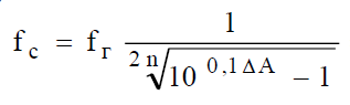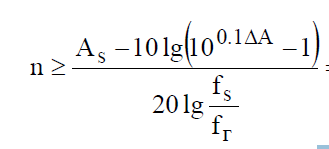 ; расчёт прядка n фильтра Баттерворта fg = 8620 ; граничная частота фильтра fs = 16880 ; частота требуемого затухания в полосе подавления As = 17 ; требуемое затухание в полосе подавления dA = 1 ; затухание на граничной частоте fg n = (As - 10*lg(10^(0.1*dA) - 1))/(20*lg(fs/fg)) = 3.91761 ; порядок фильтра n = int(n) + 1 = 4 ; округляем до ближайшего большего целого значения Рассчитаем частоту среза, при которой затухание равно 3 дБ, по формуле: