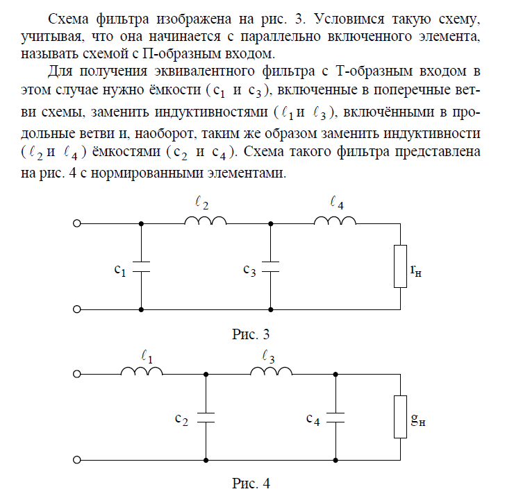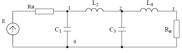 Ri = 1000 fc = 10206 kL = Ri/(2*pi*fc) = 0.01559 kC = 1/(2*pi*fc*Ri) = 1.55943E-8 ; нормированные значения индуктивностей и емкостей для П-образного фильтра c1 = 0.765 l2 = 1.848 c3 = 1.848 l4 = 0.765 gn = 1 ; истинные значения индуктивностей и емкостей для П-образного фильтра C1 = c1*kC = 1.19296E-8 ; 11.92 нФ C3 = c3*kC = 2.88182E-8 ; 28.8 нФ L2 = l2*kL = 0.02882 ; 28.8 мГн L4 = l4*kL = 0.01193 ; 11.93 мГн Окончательная схема фильтра представлена ниже: ![]() Цифрами обозначены номера узлов. Далее: ![]()