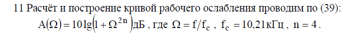 ; расчет АЧХ фильтра по аналитической формуле n = 4 ; прядок фильтра fc = 10.21 ; кГц - частота среза по уровню 3 дБ fs = 16.88 f = 0.2*fc = 2.042 A_02 = 10*lg(1 + (f/fc)^(2*n)) = 0.000011 ; затухание фильтра (АЧХ) f = 0.4*fc = 4.084 A_04 = 10*lg(1 + (f/fc)^(2*n)) = 0.002845 ; затухание фильтра (АЧХ) f = 0.6*fc = 6.126 A_06 = 10*lg(1 + (f/fc)^(2*n)) = 0.072339 ; затухание фильтра (АЧХ)\ f = 0.8*fc = 8.168 A_08 = 10*lg(1 + (f/fc)^(2*n)) = 0.673581 ; затухание фильтра (АЧХ) f = 1*fc = 10.21 A_1 = 10*lg(1 + (f/fc)^(2*n)) = 3.0103 ; затухание фильтра (АЧХ) f = 1*fs = 16.88 A_1s = 10*lg(1 + (f/fc)^(2*n)) = 17.544853 ; затухание фильтра (АЧХ) f = 1.2*fs = 20.256 A_1.2s = 10*lg(1 + (f/fc)^(2*n)) = 23.820293 ; затухание фильтра (АЧХ) f = 1.4*fs = 23.632 A_1.4s = 10*lg(1 + (f/fc)^(2*n)) = 29.163248 ; затухание фильтра (АЧХ) В заключение с целью проверки правильности расчётов рассчитаем АЧХ, исходя непосредственно из схемы фильтра и значений его элементов. При этом учтём что комплексный коэффициент передачи всего фильтра равен: K = K1*K2*K3, где Ki – коэффициент передачи по напряжению для каждого узла, обозначенного на схеме Программа расчёта: