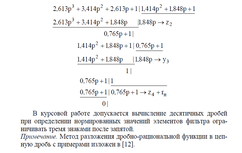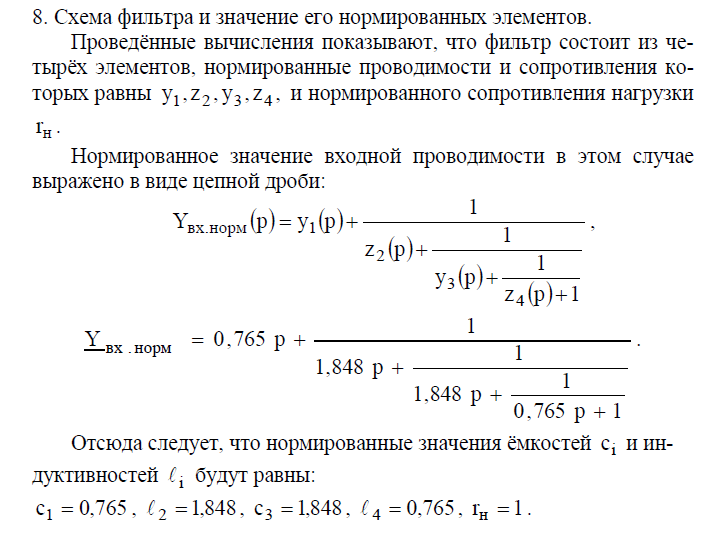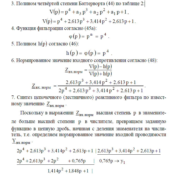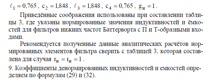 Пример расчёта фильтра БаттервортаНа этой странице дан пример расчёта фильтра нижних частот Баттерворта. В основу расчёта положены методические указания [1]. Кроме этого, теория и примеры расчётов ФНЧ Баттерворта изложены на этом сайте.Расчеты проводятся с помощью программируемого онлайн калькулятора КАН. Приведенные ниже программы могут быть использованы для выполнения своих собственных расчётов. Берём конкретный пример из методички [1]. Аналитический расчёт фильтра нижних частот Баттерворта1) определение числа элементов n;2) определение полинома Баттерворта; 3) определение нормированного входного сопротивления; 4) синтез лестничной схемы путём разложения дробно-рациональной функции в цепную дробь; 5) составление схемы фильтра и определение нормированных параметров её элементов; 6) расчёт истинных значений параметров элементов схемы; 7) расчёт значений рабочего ослабления на частотах 0,2fC, 0,4fC, 0,6fC, 0,8fC, fГ, fS, 1,2fS, 1,4fS; 8) построение графика частотной зависимости рабочего ослабления; 9) проверка фильтра на соответствие техническим требованиям. Задание: Рассчитать фильтр нижних частот Баттерворта с граничной частотой полосы пропускания (ПП) fг = 8620Гц и максимальным рабочим ослаблением в этой полосе ΔA = 1дБ . На граничной частоте полосы задерживания (ПЗ) fs = 16880Гц , рабочее ослабление As ≥ 17 дБ . Сопротивления источника и нагрузки Rи = Rн = R = 1000Ом . Расчитать рабочее ослабление A при f = fг ;fc ;15кГц;fs ;20кГц и построить кривую A(f ). Расчёт Определяем порядок фильтра на основании формулы: