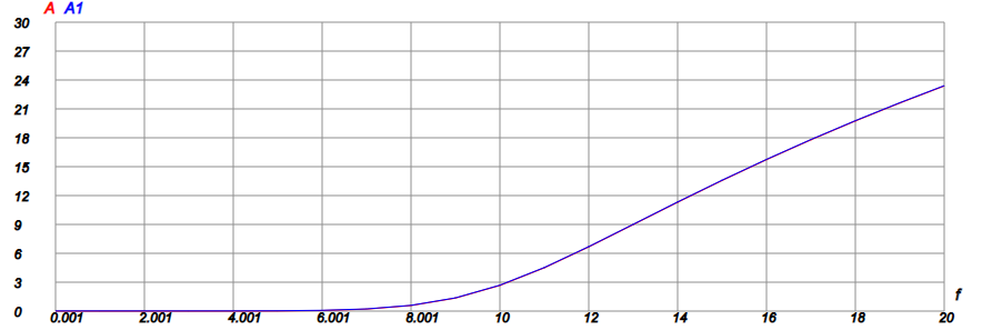 ; расчет АЧХ фильтра по аналитической формуле n = 4 ; прядок фильтра fc = 10.21 ; кГц - частота среза по уровню 3 дБ [f = 0:20, 1 ; пределы изменения частоты и шаг в кГц Omega = f/fc ; нормированная частота A = 10*lg(1 + Omega^(2*n)) ; затухание фильтра (АЧХ) val (f, A); вывод значений в таблицу и на график ] grafY(0,30) ; пределы по оси Y ---------------- Таблица данных ------------ стр. f A 1 0 0 2 1 3.67772E-8 3 2 9.41495E-6 4 3 0.00024 5 4 0.00241 6 5 0.01434 7 6 0.06134 8 7 0.207 9 8 0.57694 10 9 1.34983 11 10 2.66426 12 11 4.49516 13 12 6.6663 14 13 8.98057 15 14 11.30249 16 15 13.56087 17 16 15.72533 18 17 17.78676 19 18 19.74603 20 19 21.60832 21 20 23.38033Ниже показан график АЧХ. ![]() Далее: 7) расчёт значений рабочего ослабления на частотах 0,2fC, 0,4fC, 0,6fC, 0,8fC, fГ, fS, 1,2fS, 1,4fS;